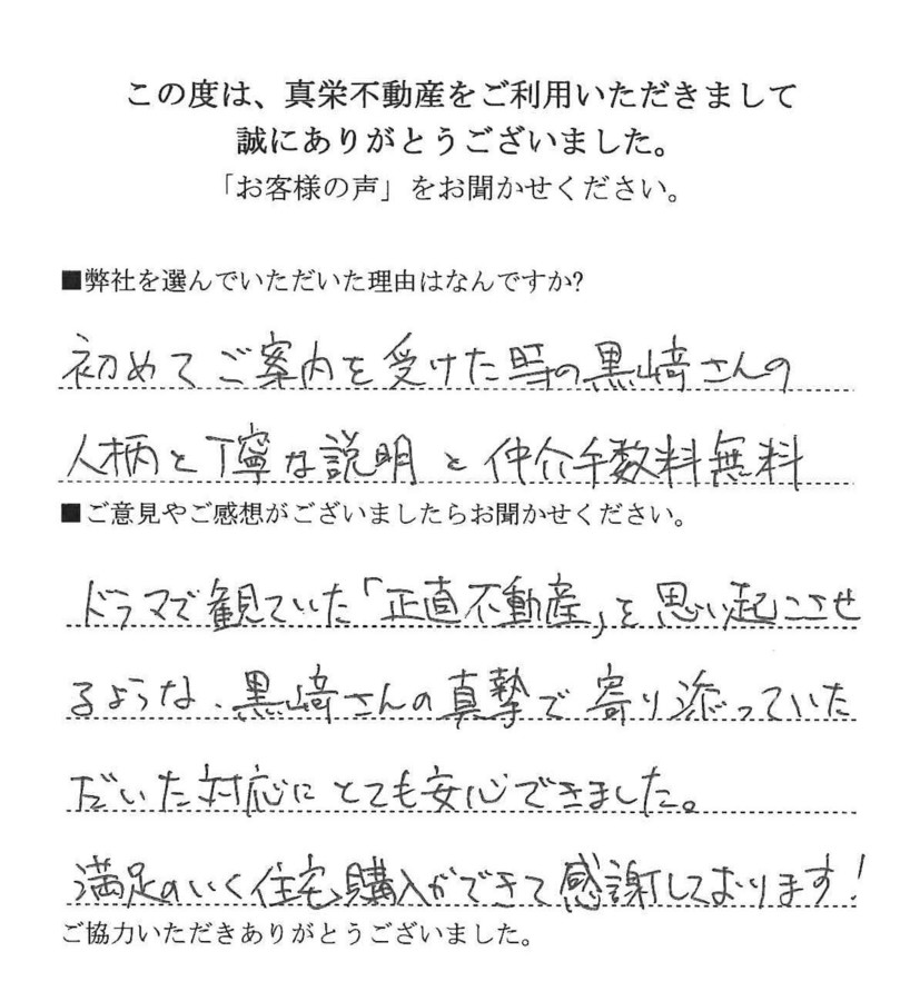 ドラマで観ていた「正直不動産」を思い起こさせるような、黒﨑さんの真摯で寄り添っていただいた対応にとても安心できました。満足のいく住宅購入ができて感謝しております!