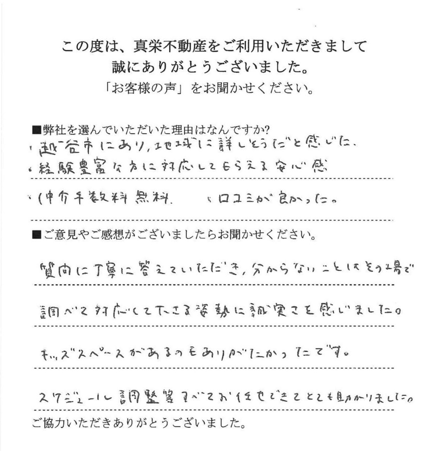 越谷市にあり、地域に詳しそうだと感じた。経験豊富な方に対応してもらえる安心感。仲介手数料無料。口コミが良かった。
